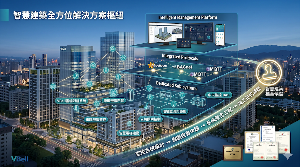串接 VBell 雲端對講、臉部辨識門禁與 BAS 中央監控,構建防護網。